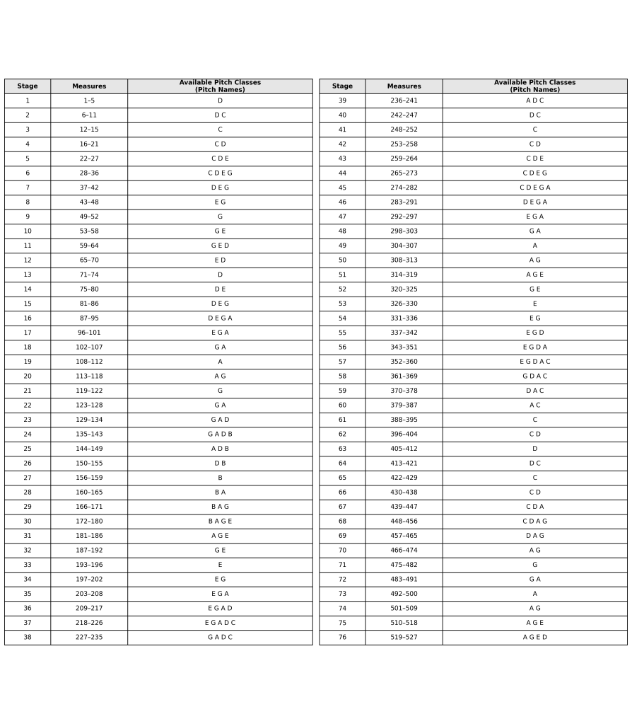 Through this process, the set of available pitch classes changes in 76 stages (see Table 1).