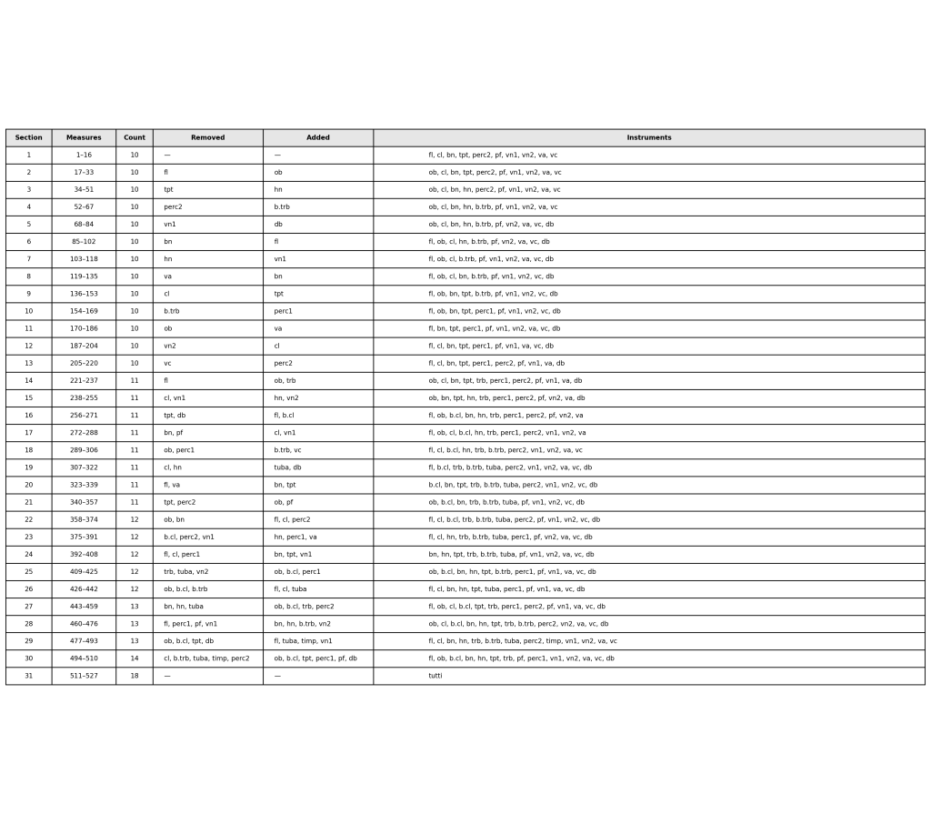 - Sections 1–13: 10 instruments, with 1 instrument exchanged per section