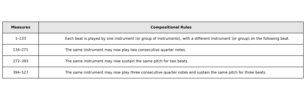 The compositional rules gradually loosen over the course of the work. See Table 3.